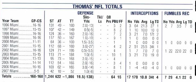 Today's entry is the Dolphins and Zach Thomas. Thomas signed with the Dallas cowboys in 2008 and here is the 2008 Media Guide entry for his career statistics plus the 20o8 tackle totals by the coaches.